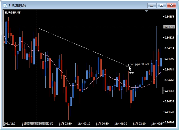 • カーソル時間(十字線、垂直線、ラインなしのすべて)表示中に shift キーを押しながらチャートをドラッグすると値幅(pips)と時間の差分を計測できるようにしました。MT5 標準の十字カーソルとほぼ同機能です。カーソル時間をキー入力で表示/非表示できるようにしたので、よりカジュアルに計測が可能です。