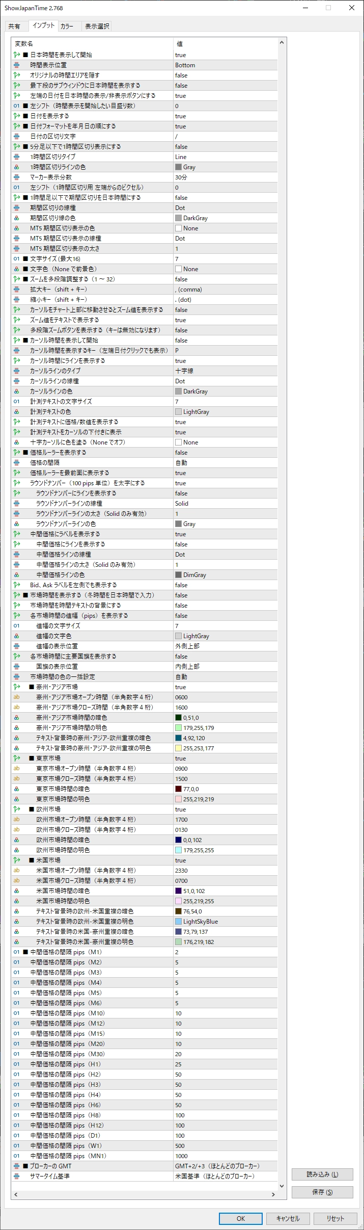 • ブローカーの GMT ご利用の FX 口座が採用する GMT(グリニッジ標準時)の設定です。正しい GMT が選ばれていないと日本時間がずれて表示されます。ほとんどの方の口座は GMT +2/+3 を採用していますので変更の必要はありません。 GMT 0 を採用する口座をご利用の場合は GMT -1/0 へ変更する必要があります。簡単に見分ける方法として、期間区切り表示(MT4/MT5 の 0:00)が日本時間の午前10時、または午前9時(夏時間)に表示される口座が GMT 0 を採用する口座です。日本時間の午前7時、または午前6時(夏時間)に表示される口座はデフォルトの GMT +2/+3 採用の口座です。 ※ ブローカー GMT の自動判別は断念しました。