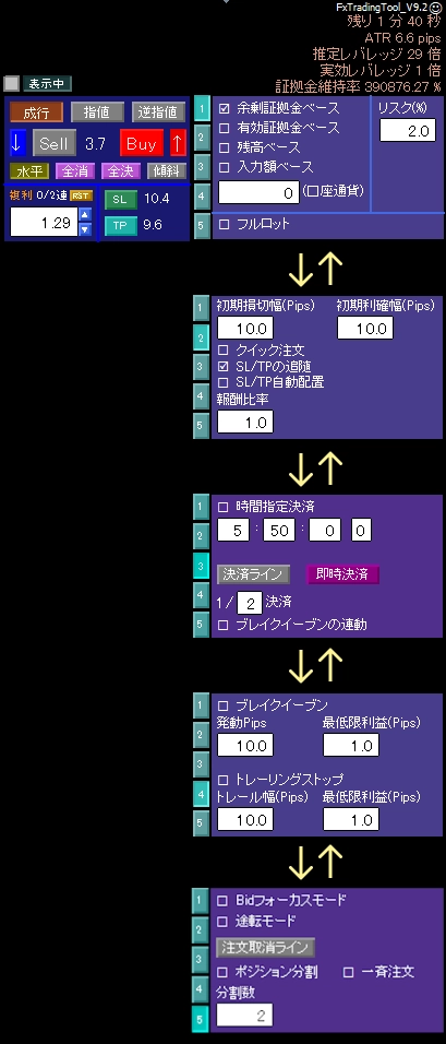※2 上記10〜16の機能は当ツールを適用している通貨ペアに対する全ポジションが対象となります(=当ツール以外を使っての注文も対象)。