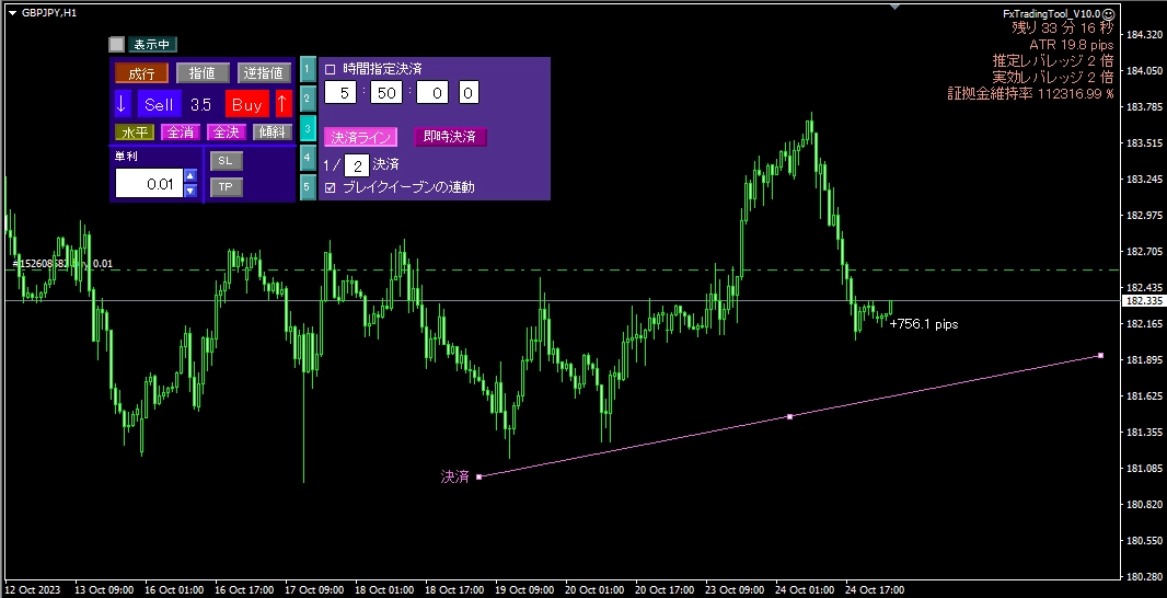 - 斜線(水平線も可)の位置で分割決済させることができます。分割決済後に残ったポジションに対してブイレクイーブンを即時に発動することもできます。ただしこの決済ラインは1チャートにつき1本のみの表示となります。