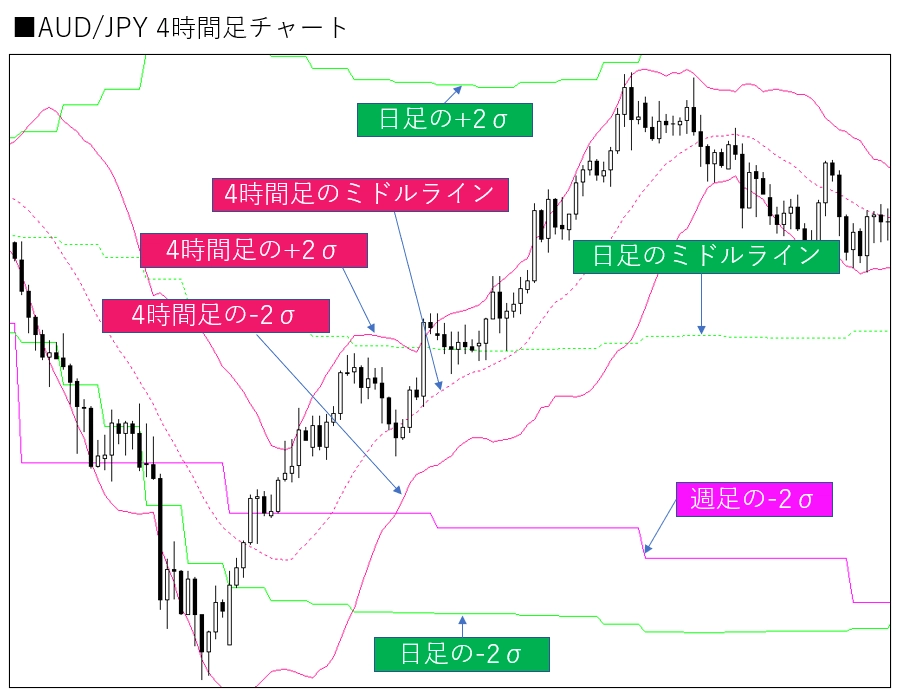 時間足毎に異なる色で表示が出来、上位時間足のボリンジャーバンドを下位時間足で表示出来ます。