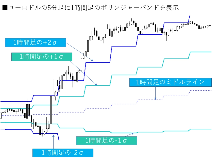 上位時間足のボリンジャーバンドを下位の時間足で表示できます。