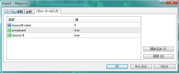 ④MT4を再起動すると、エキスパートアドバイザ一覧にKEG_Magicomが表示されているので、使いたいチャートに入れる。