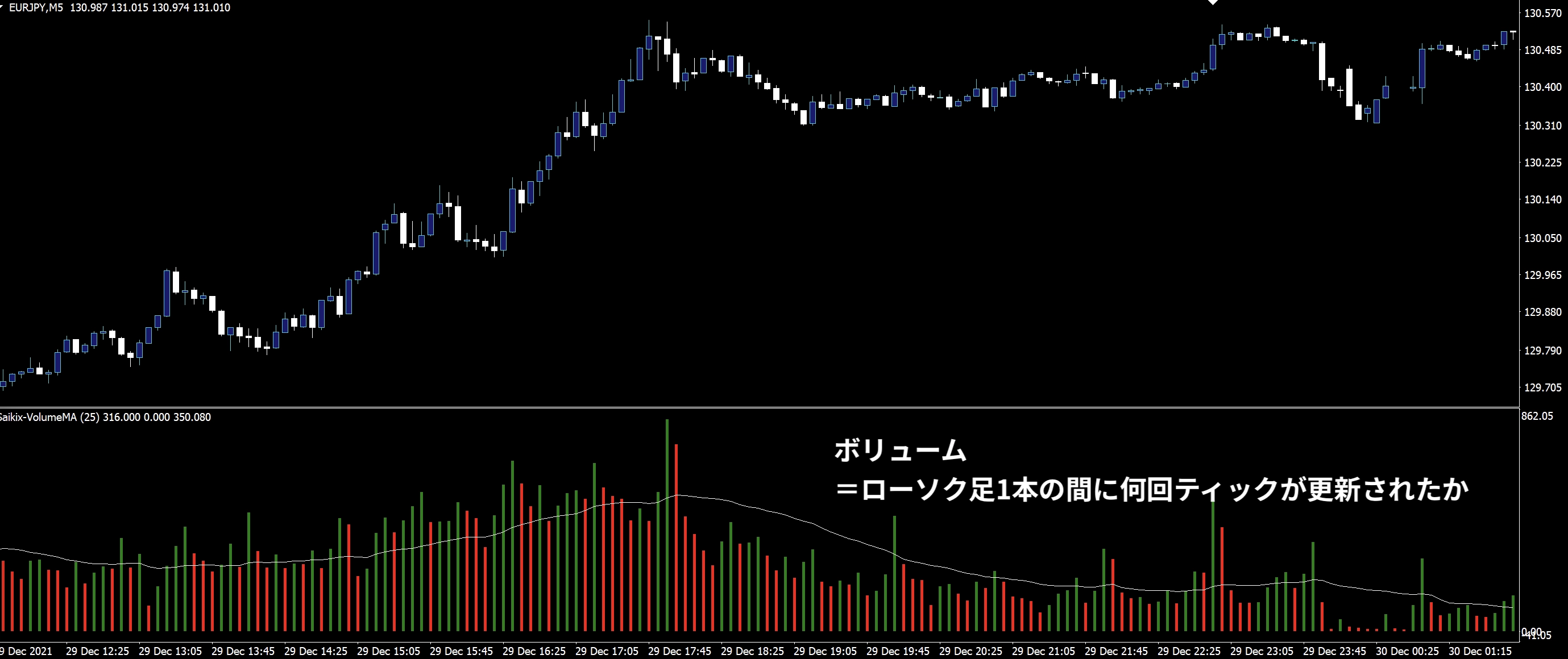 Saikix-Volume-MA.ex4」は出来高(ボリューム)に、移動平均線を表示するMT4インジケーターです。