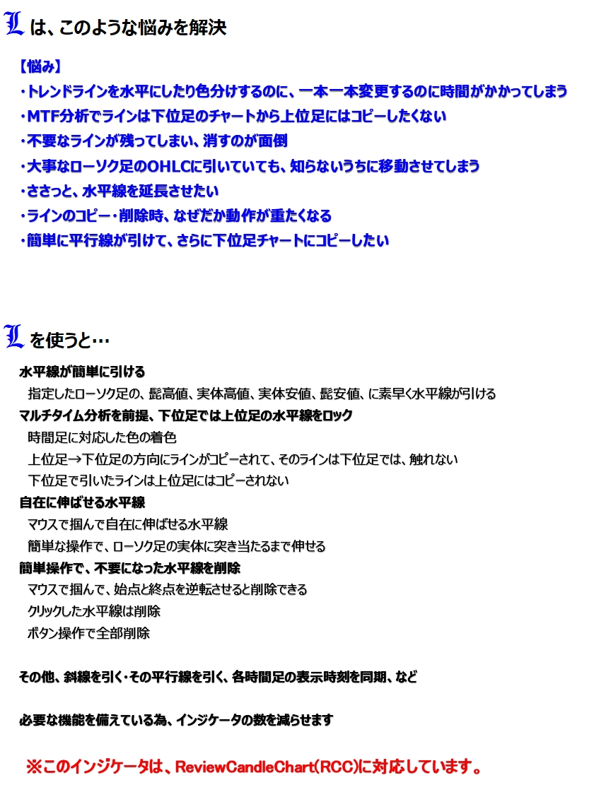 L is MetaTrader Indicator - 9.1枚のチャート上でRCCMTFCandleと連携して上位足の水平線を引く →1チャート上で上位足の水平線が引け、チャートの表示枚数を減らせる
