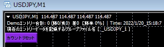 ↑チャート画面の左上の1段目には、デモエントリーのカウントや勝率を表示する文字が表記されています。2段目には、現在のチャート上のエントリーデータを記録するグループフャイル名が表記されてます。3段目には、カウントリセットボタンがあり1段目のカウントを好きなタイミングで、”0”に戻すことも出来る仕様です。