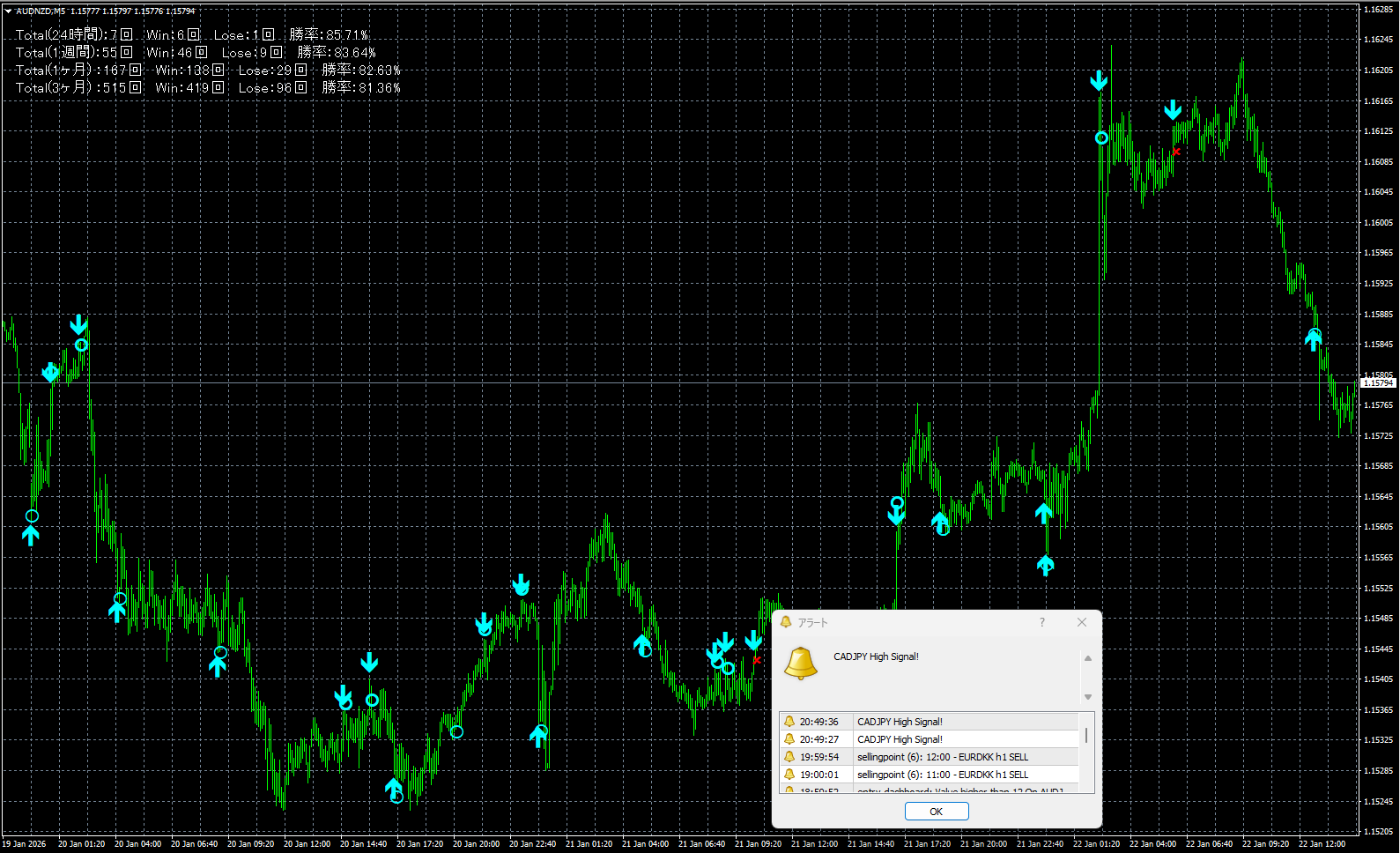 短期足(1分・5分)でも高い精度を維持し、相場の勢いが一瞬で変化する場面でも安定したサインを提示。