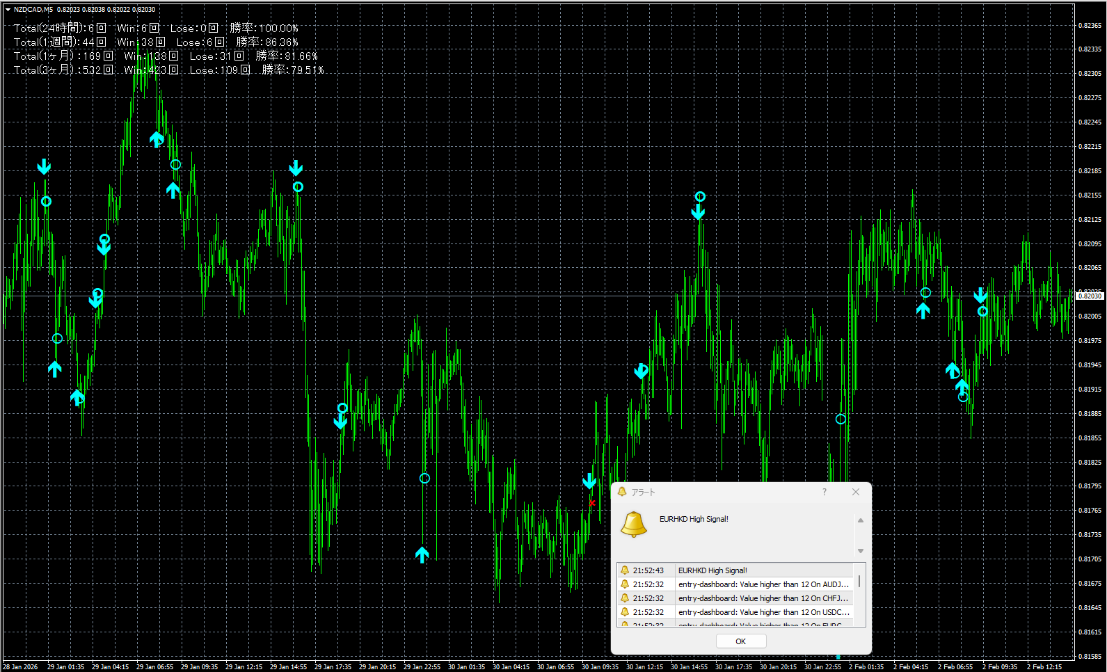 短期足(1分・5分)でも高い精度を維持し、相場の勢いが一瞬で変化する場面でも安定したサインを提示。