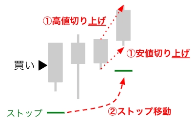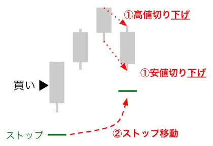 前回の高値と安値をそれぞれエントリー方向とは逆行して切り上げ/切り下げた場合にストップを移動する機能です。