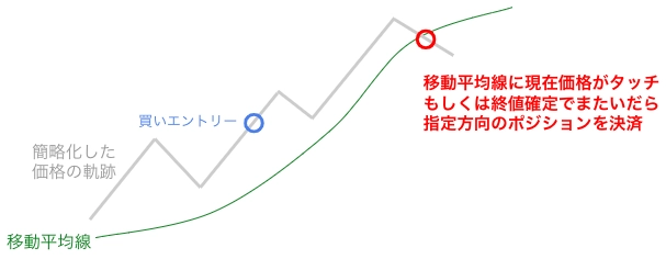 現在価格が移動平均線にタッチもしくは終値確定でまたいだら指定方向のポジションを決済する機能です。