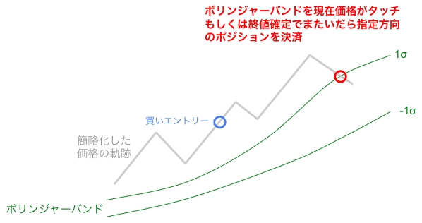 現在価格がボリンジャーバンドにタッチもしくは終値確定でまたいだら指定方向のポジションを決済する機能です。