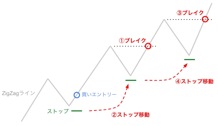 ZigZagの直近高値/安値をブレイクする度に高値/安値付近にストップを移動する機能です。