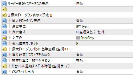 サーバ情報/ステータスの表示:デフォルト【無効】 【有効】にした場合、チャート左上にマーケット開場時間・サーバ時間・日本時間・サマータイム情報を表示します。 なお、同一チャート上で稼働するEAによっては表示がちらついたり正しく表示されないことがありますので、その場合は【無効】にしてください。 ※ 本機能はすべてのブローカーで正しい情報が得られることを保証するものではありません。 最大ドローダウン表示:デフォルト【有効】 【有効】にした場合、チャート右上に最大ドローダウンを記録した日時・金額・ 証拠金との比率を表示します。 通貨単位:デフォルト【円】 最大ドローダウン表示・収益表示・各通知に表示する通貨単位です。 円表記にすると 整数+円、ドル表記にすると 小数第二位 までを表示します。 表示書式:デフォルト【円/ドルとパーセント】 ドローダウンの表記を選択します。 円/ドルとパーセント → 〇〇○円 (△△%) 円/ドルのみ → 〇〇○円 パーセントのみ → △△% 文字色:デフォルト【DarkGray】 最大ドローダウンを表示する文字色です。 表示位置オフセット:デフォルト【0】 最大ドローダウン表示の上からの表示位置オフセットを指定します。 EAなど別のプログラムの表示と重なってしまったときなどに オフセット値を入力します。 最大ドローダウン比率 基準金額:デフォルト 空欄 ドローダウン比率の基準とする証拠金額を指定します。 空欄の場合はドローダウン発生時の口座残高+クレジットに対する含み損のパーセント比となります。 損益計算にスワップを含める:デフォルト【有効】 損益計算に手数料を含める:デフォルト【有効】 リセット&通知する日本時間(空欄:サーバ時間0時):デフォルト 空欄 最大ドローダウンの記録をリセットする時間・各通知を送信する時間を日本時間で指定します。 【空欄】の場合、サーバー時間0時(サーバー日付切り替わり時)になります。 CSVファイル出力:デフォルト 有効 毎日のリセット&通知時間に、前日の収支と最大DDをCSVファイルに出力します。出力ファイルは [[ MT4インストールフォルダ ]]\MQL4\Files\EAHelperInfo_[口座番号].csv となります。日々追記されていきますので、ファイルサイズの肥大化にご注意下さい。