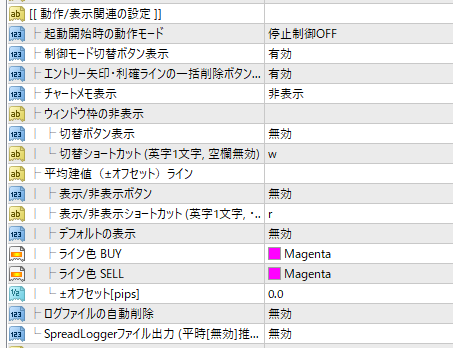 チャートウィンドウの移動や操作ができなくなりますので、チャートウィンドウを希望の配置に 並べた後に機能を有効にして下さい。同一MT4内の複数のEAHelperで「ウィンドウ枠の非表示化」を 有効にした場合、正しく機能しない場合があります。 切替ボタン表示:デフォルト【無効】 【有効】にした場合、切り替えるためのボタンを表示します 切替ショートカット:デフォルト【w】 切り替えるためのショートカットキーに使用するキーを指定します。 英字1文字の設定、空白時はショートカットキー未設定となります。 平均建値(±オフセット)ライン 現在のチャート上で保有している買いポジション・売りポジションの平均建値のラインを表示します。 表示/非表示ボタン:デフォルト【無効】 【有効】にした場合、切り替えるためのボタンを表示します 表示/非表示ショートカット:デフォルト【r】 切り替えるためのショートカットキーに使用するキーを指定します。 英字1文字の設定、空白時はショートカットキー未設定となります。 デフォルトの表示:デフォルト【無効】 【有効】にした場合、平均建値ライン表示をデフォルトで有効にします。 ライン色 BUY・SELL:デフォルト【Magenta】 【有効】にした場合、平均建値ライン表示をデフォルトで有効にします。 ±オフセット[pips]:デフォルト【0.0】 平均建値ラインを指定pipsズラしたところに引く場合、そのオフセットpips値を指定します。 過去ログファイルの自動削除:デフォルト【無効】 MT4フォルダ内にたまる過去のログファイルを定期的に削除します。以下のサブフォルダ内のログファイルを削除します ・[MT4フォルダ]\logs ・[MT4フォルダ]\tester\logs ・[MT4フォルダ]\MQL4\Logs SpreadLoggerファイル出力:デフォルト【無効】 【有効】にした場合、MQL4\Files配下にスプレッドのログを出力します。 有効時の動作負荷が高いため、同一MT5内の複数EAHelperで同時に出力することはできません。 平均・最大・最小スプレッドを算出・表示は SpreadLoggerAnalyzer.exe をご使用ください。