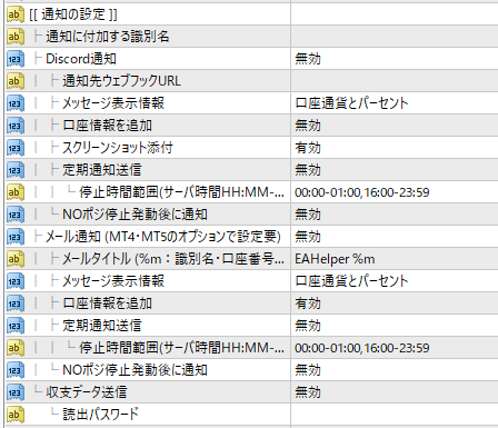 通知先ウェブフックURL:デフォルト 空欄 通知を行う先のDiscordチャンネルのウェブフックURLを入力します。 Discordサーバ名の右▼をクリック → サーバー設定 → 連携サービス → ウェブフック →「新しいウェブフック」 → 生成された「Spidey Bot」を選ぶ。送信したいチャンネルを選択して「ウェブフックURLをコピー」。 詳しくはググって下さい メッセージ表示情報:デフォルト【円/ドルとパーセント】 通知するメッセージの表示形式を選択します。 円/ドルとパーセント → 〇〇○円 (△△%) 円/ドルのみ → 〇〇○円 パーセントのみ → △△% 口座情報を追加:デフォルト【無効】 最新の以下の情報を通知メッセージに記載します。 残高・クレジット・有効証拠金・含み損益・余剰証拠金・保有ポジション数・証拠金維持率 スクリーンショット添付:デフォルト【有効】 Discord通知に送信時のチャート画面スクリーンショットを添付する場合【有効】にします。 定期通知送信:デフォルト【無効】 本Discord通知を時間ごとに定期的に送信します。 送信する時間はリセット時間を起算とし1・2・3・4・6・12時間ごとからの選択です。 停止時間範囲:デフォルト【00:00-01:00,16:00-23:59】 定期通知の送信を停止する時間をサーバ時間の範囲で指定します この時間範囲内は、定期通知は送信されません NOポジ停止発動後に通知:デフォルト【無効】 NOポジ停止モードで自動売買ボタンがOFFされたとき、LINEに通知する場合【有効】にします。 メール通知:デフォルト【無効】 前日の損益・最大ドローダウンを記録した日時・日付・ドローダウン率のメール通知を行う場合 【有効】にします。最大ドローダウン記録をリセットするタイミングでの通知となります。 メールタイトル:デフォルト【EAHelper %m】 送信されるメールのタイトルです "%m"は、識別名または口座番号に置き換えられます メッセージ表示情報:デフォルト【円/ドルとパーセント】 通知するメッセージの表示形式を選択します。 円/ドルとパーセント → 〇〇○円 (△△%) 円/ドルのみ → 〇〇○円 パーセントのみ → △△% 口座情報を追加:デフォルト【無効】 最新の以下の情報を通知メッセージに記載します。 残高・クレジット・有効証拠金・含み損益・余剰証拠金・保有ポジション数・証拠金維持率 定期通知送信:デフォルト【無効】 本メール通知を時間ごとに定期的に送信します。 送信する時間はリセット時間を起算とし1・2・3・4・6・12時間ごとからの選択です。 停止時間範囲:デフォルト【00:00-01:00,16:00-23:59】 定期通知の送信を停止する時間をサーバ時間の範囲で指定します この時間範囲内は、定期通知は送信されません NOポジ停止発動後に通知:デフォルト【無効】 NOポジ停止モードでアルゴリズム取引ボタンがOFFされたとき、メールに通知する場合【有効】にします。 収支データ送信:デフォルト【無効】 KMカレンダー・自動収支集計表スプレッドシート・Excelにデータ送信する場合は【有効】にします。 読出パスワード:デフォルト 空欄 収支データを受信するときのパスワードを入力します。 パスワードは半角の英数字のみで日本語は使用できません。 トラブル防止の為 数字のみ・英字のみは非推奨 です。