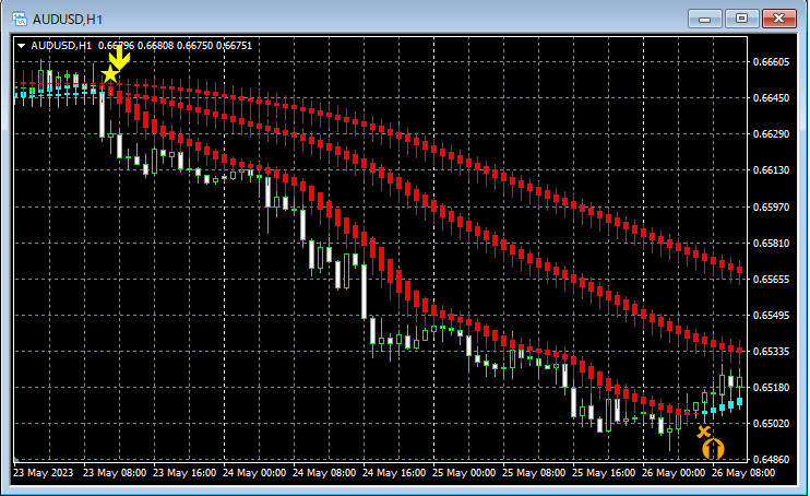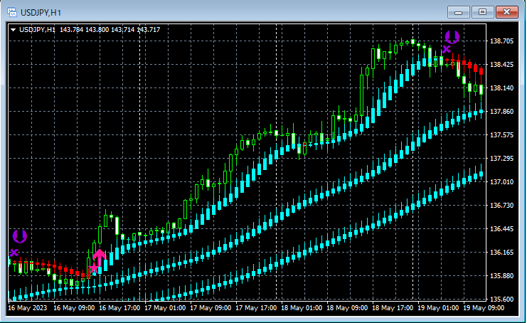 ここでは【HAS3SD_B】のサインの例について紹介します。 【HAS3SD_B】 HAS3SD_Bのサイン,平均足スムーズド ※本インジケーターには、平均足スムーズドを表示するインジケーターは同梱されておりませんのでご注意下さい。 上図では説明の便宜上平均足スムーズドを表示しておりますが、実際は本インジケーターを設置しても平均足スムーズドは表示されません。  3本の平均足スムーズドの方向が上向きにそろっていない状態(陽線にそろっていない状態)にあるローソク足の次のローソク足で3本の平均足スムーズドの方向が上向きにそろう(陽線にそろう)とピンク色の星印が点灯します。  そして、あるローソク足の終値レベルでピンク色の星印の点灯が確定すると、その次のローソク足の寄り付きと同時にピンク色の矢印が点灯します。  3本の平均足スムーズドの方向が上向きにそろっている状態(陽線にそろっている状態)にあるローソク足の次のローソク足で3本の平均足スムーズドの方向が上向きにそろっていない状態になるとダークバイオレット色のバツ印が点灯します。  そして、あるローソク足の終値レベルでダークバイオレット色のバツ印の点灯が確定すると、その次のローソク足の寄り付きと同時にダークバイオレット色の矢印が点灯します。 HAS3SD_Bのサイン,平均足スムーズド ※本インジケーターには、平均足スムーズドを表示するインジケーターは同梱されておりませんのでご注意下さい。 上図では説明の便宜上平均足スムーズドを表示しておりますが、実際は本インジケーターを設置しても平均足スムーズドは表示されません。  3本の平均足スムーズドの方向が下向きにそろっていない状態(陰線にそろっていない状態)にあるローソク足の次のローソク足で3本の平均足スムーズドの方向が下向きにそろう(陰線にそろう)と黄色の星印が点灯します。  そして、あるローソク足の終値レベルで黄色の星印の点灯が確定すると、その次のローソク足の寄り付きと同時に黄色の矢印が点灯します。  3本の平均足スムーズドの方向が下向きにそろっている状態(陰線にそろっている状態)にあるローソク足の次のローソク足で3本の平均足スムーズドの方向が下向きにそろっていない状態になるとオレンジ色のバツ印が点灯します。  そして、あるローソク足の終値レベルでオレンジ色のバツ印の点灯が確定すると、その次のローソク足の寄り付きと同時にオレンジ色の矢印が点灯します。