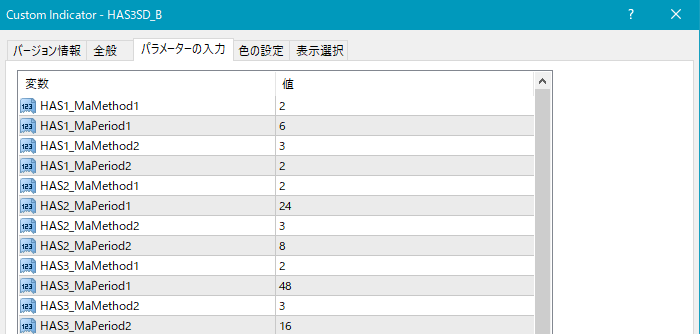 下図の通り、"DLLの使用を許可する" にチェックを入れる必要があります。 星印、矢印やバツ印の発生条件に関する設定項目   短期の平均足スムーズド    HAS1_MaMethod1 : (第1段階の)移動平均の方法 (初期設定では 2)    HAS1_MaPeriod1 : (第1段階の)移動平均の期間 (初期設定では 6)    HAS1_MaMethod2 : (第2段階の)移動平均の方法 (初期設定では 3)    HAS1_MaPeriod2 : (第2段階の)移動平均の期間 (初期設定では 2)   中期の平均足スムーズド    HAS2_MaMethod1 : (第1段階の)移動平均の方法 (初期設定では 2)    HAS2_MaPeriod1 : (第1段階の)移動平均の期間 (初期設定では 24)    HAS2_MaMethod2 : (第2段階の)移動平均の方法 (初期設定では 3)    HAS2_MaPeriod2 : (第2段階の)移動平均の期間 (初期設定では 8)   長期の平均足スムーズド    HAS3_MaMethod1 : (第1段階の)移動平均の方法 (初期設定では 2)    HAS3_MaPeriod1 : (第1段階の)移動平均の期間 (初期設定では 48)    HAS3_MaMethod2 : (第2段階の)移動平均の方法 (初期設定では 3)    HAS3_MaPeriod2 : (第2段階の)移動平均の期間 (初期設定では 16)   移動平均の方法     0:単純移動平均線(SMA,Simple MA)     1:指数平滑移動平均(EMA,Exponential MA)     2:平滑移動平均線(SMMA,Smoothed MA)     3:線形加重移動平均線(LWMA,Liner Weighted MA) 星印、矢印やバツ印の表示位置に関する設定項目  星印、矢印やバツ印の表示位置がローソク足に近すぎて見にくかったり、逆に遠すぎて場合によっては表示位置が画面外になってしまう場合もあります。これらの印を表示する高さを、下記の設定項目の値を調整することにより、修正することができます。値が大きいほど表示位置はローソク足から離れていきます。    (初期設定ではピンク色の)星印 → DeepPinkStar    (初期設定ではピンク色の)矢印 → DeepPinkArrow    (初期設定では黄色の)星印 → YellowStar    (初期設定では黄色の)矢印 → YellowArrow    (初期設定ではダークバイオレット色の)バツ印 → DarkVioletStar    (初期設定ではダークバイオレット色の)矢印 → DarkVioletArrow    (初期設定ではオレンジ色の)バツ印 → OrangeStar    (初期設定ではオレンジ色の)矢印 → OrangeArrow  また、下記の項目の値を変更することにより、星印、矢印やバツ印の形状を変更することができます。    (初期設定ではピンク色の)星印 → Arrowtype1    (初期設定ではピンク色の)矢印 → Arrowtype2    (初期設定では黄色の)星印 → Arrowtype3    (初期設定では黄色の)矢印 → Arrowtype4    (初期設定ではダークバイオレット色の)バツ印 → Arrowtype5    (初期設定ではダークバイオレット色の)矢印 → Arrowtype6    (初期設定ではオレンジ色の)バツ印 → Arrowtype7    (初期設定ではオレンジ色の)矢印 → Arrowtype8  なお、 星印、矢印やバツ印あるいはその代わりとして使用できる記号とそれに対応する番号は下表の通りです。  星印や矢印の変更については下記の投資ナビ+の記事をご覧下さい。    https://www.gogojungle.co.jp/finance/navi/359/19177 アラートに関する設定項目 UseAlert:  下図のようなアラートダイアログによりサイン発生を知らせる機能を使用する場合には true、使用しない場合には false を選択する。 UseMail:  メールによりサイン発生を知らせる機能を使用する場合には true、使用しない場合には false を選択する。 UseSound:  アラート音によりサイン発生を知らせる機能を使用する場合には true、使用しない場合には false を選択する。 SoundFile:  アラート音に使うサウンドのファイル名を入力する。 UsePush:  プッシュ通知によりサイン発生を知らせる機能を使用する場合には true、使用しない場合には false を選択する。 メールによりサイン発生を知らせる機能を使用する場合のMT4側の設定の一例 ツール → オプション → E-メール イメージ図 ※設定後にMT4を再起動させる必要があるようです。