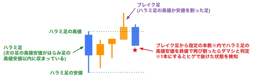 ハラミ足の安値から高値までをレンジと捉えて、その安値または高値をBid価格が抜いたらブレイクしたと判断します。ブレイク後にパラメータで指定した足数だけ再びハラミ足のブレイクした方の安値または高値を抜き返したかどうかを判定します。