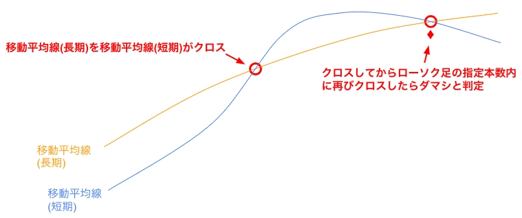 移動平均線(長期)を移動平均線(短期)が抜いてから、パラメータで指定した本数分だけ再び移動平均線(長期)を移動平均線(短期)が抜き返したらダマシと判断します。