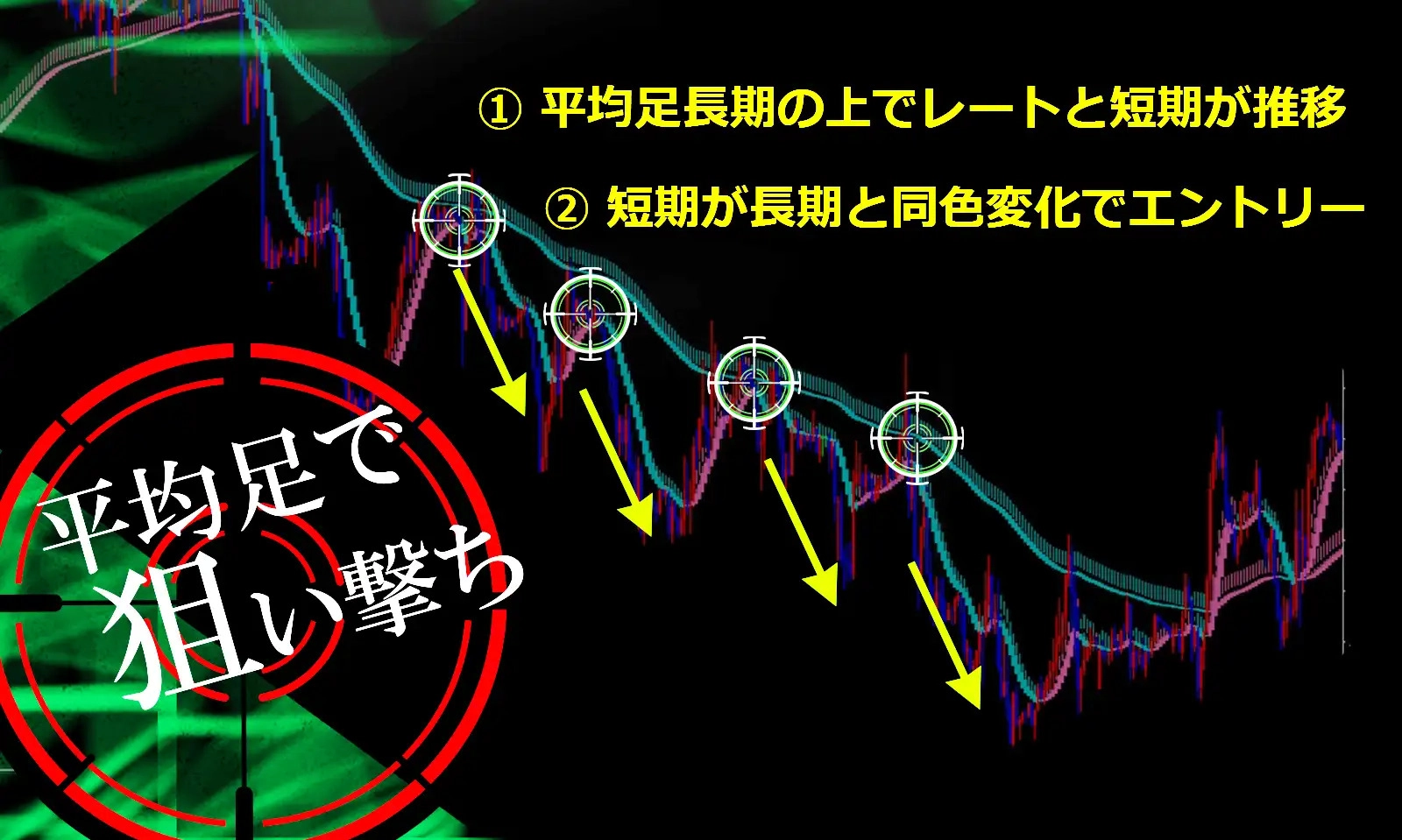 この手法をもってトレードを継続していけば、自身の目でチャートが見えるようになり、 この平均足インジケーターもいずれ必要なくなるでしょう。 インジケーター、サインツール任せのトレードは、 絶対に勝てるようにはなりませんので、あくまで補助としての立ち位置です。 この概念が分かるようになった時が、負けトレーダーから抜け出せる第一歩なのです。