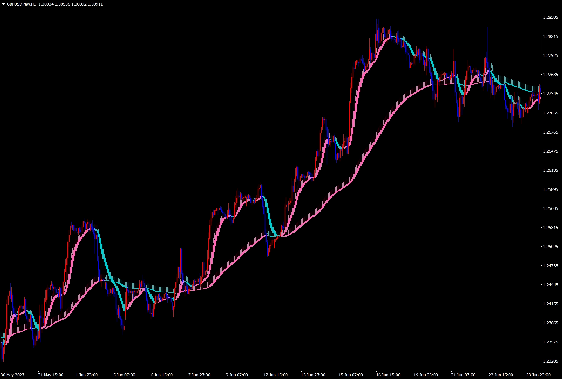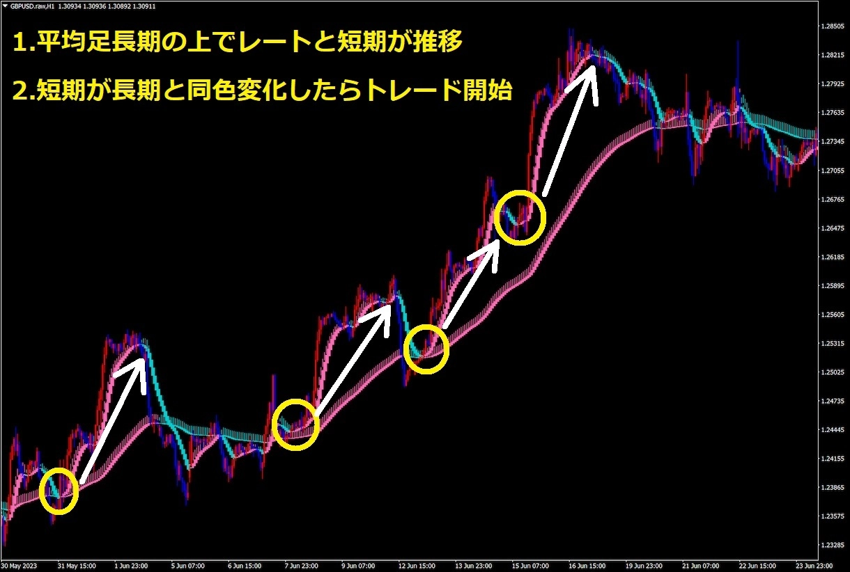 こちらはダウ理論を基に平均足を同時に使って、相場の流れに沿ったトレンドフォロー(順張り)でトレードを行う手法となっております。 ※当ページはインジケーター・テンプレートファイルのみのご提供となります(製品版とパラメーター数値が若干異なります)。 ダウ理論と当手法ルールを解説した教科書とオリジナルカスタム平均足インジケーター(アラート・メール&LINE通知)・テンプレートのセットが必要な場合は上記よりお求め下さい。