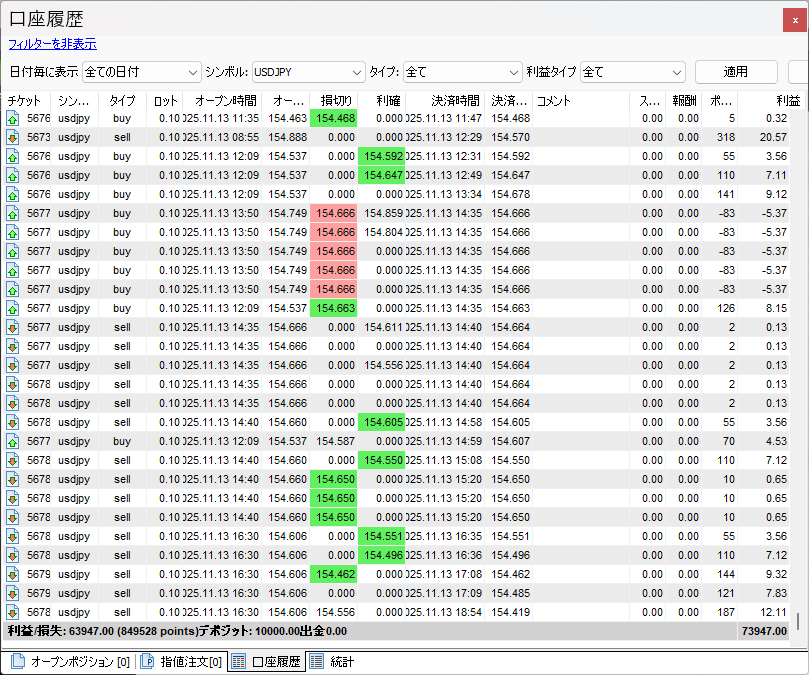 お世話になっております。 嬉しい報告です。 シンプルロジックの開発と提供をしていただきありがとうございます。 これまでとは全く環境が変わってプラス収支を納めることができるようになってきました。 約1ヵ月ほどロジックの研究を重ね、ようやく自分の理想の形になりました。 結局、行きついたところはゴールドのスキャルです。 いままで何度もスキャルをやって、自分には向いてないと諦めていたのですが、このたびシンプルGを提供いただきパラメータの研究をすることで、プラス収支にできるようになりました。 パラメータの設定についてもご報告いたします。 これは、本当に苦労しました、、、 自分の中で「すり抜けロジック」と名付けました。(勝手に命名してすみません、、、) もみあい基準値のおかげで、毎回設定を変えることなく、ボラティリティに合ったロジックに自動で順応できます!(素晴らしいです!) ~ロジック部分については中略~ それと陰陽決済を採用しています。 これは、ほんとに素晴らしいです!スキャルにはなくてはならないものとなっています。 自分の感情いれることなく自動で損切してくれるので、連敗が続いたとしてもトータルでは回収できてしまいます。 ほんとに、この機能はすごいですし、助かっています。 収支のほうは始めたのが4/24でまだ1週間ほどなのですが、30万円の初期資金が100万円までになりました! 陰陽決済を取り入れているため勝率は低く45%程度なのですが、もっと勝率を上げられるように頑張ります!! 重ね重ねになりますが、このような素晴らしいロジックを開発していただき本当にありがとうございます。