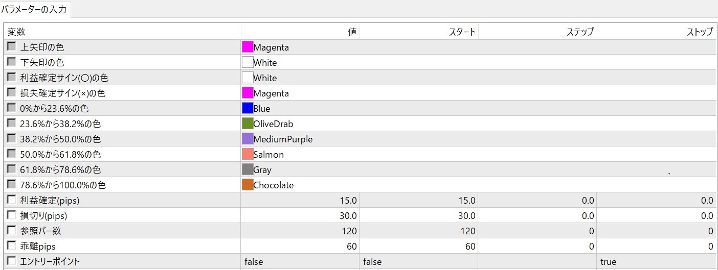 確認の補助ツールとして、インジケーターのパラメーターに「エントリーポイント」を搭載しております。 デフォルトは[false]なので、[true]にしていただくと、矢印(エントリー)の下に比率が表示されます。