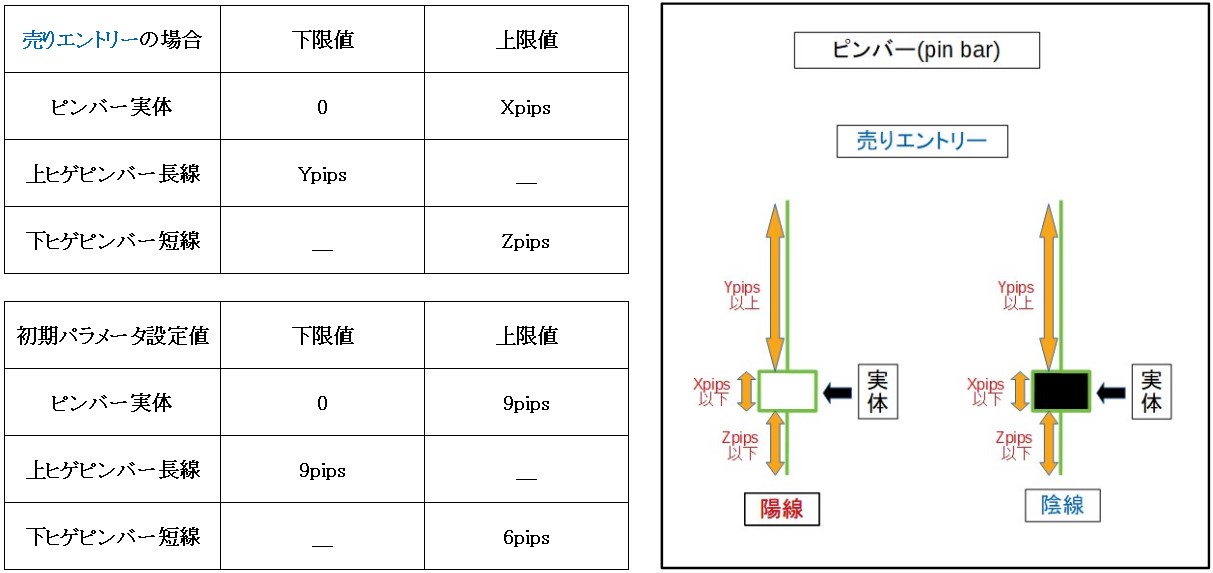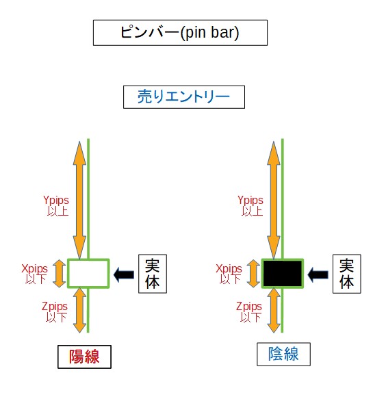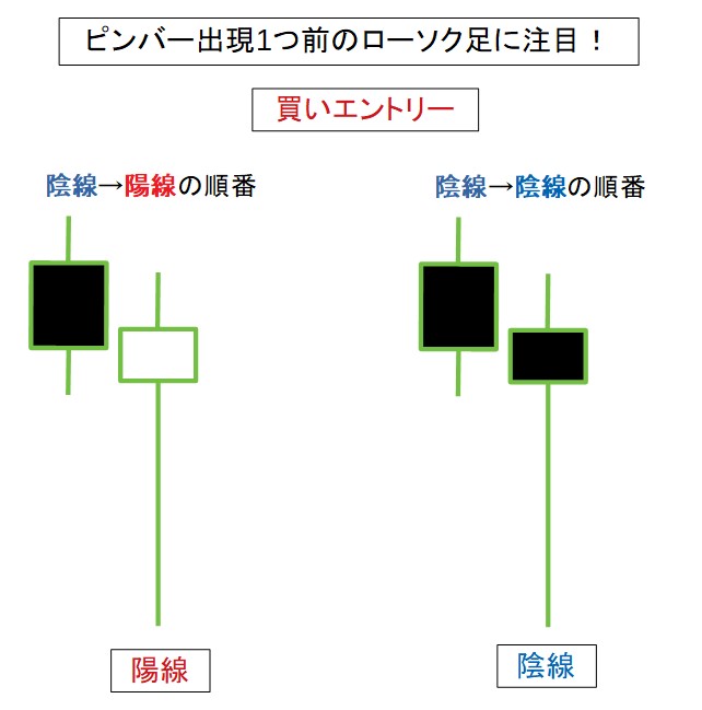 嬢黄蜂の制御条件は、ピンバー出現1つ前のローソク足が陽線か陰線かを判断ポイントとします。