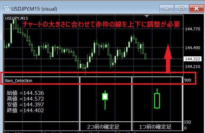 チャートの形状によってはローソク足が隠れてしまうので、チャートの大きさに合わせて適宜【サブウィンドウの上限値(900)の線】を上下に動かして調整してください。
