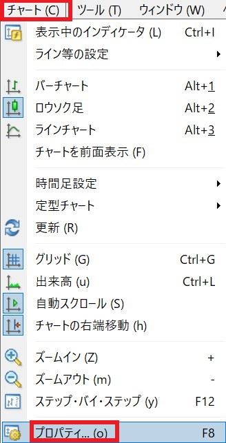 MT4チャート陽線、陰線の色の設定方法について (1)画面上部の「チャート」をクリック (2)「プロパティ」をクリック