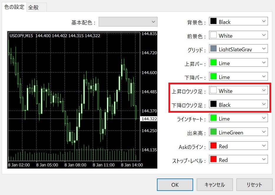 ・下降ロウソク足 → 「Black」に変更。