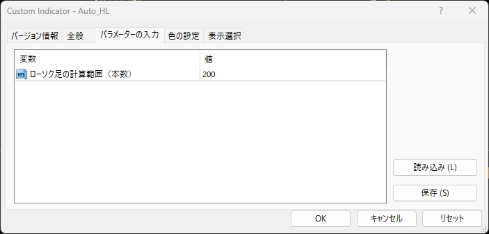 上記の図は過去200本分のローソク足を元に 最高値と最安値の価格にラインを引いています。 導入時にパラメーター設定することで 過去何本分のローソク足を計算し 最高値と最安値を算出できます。