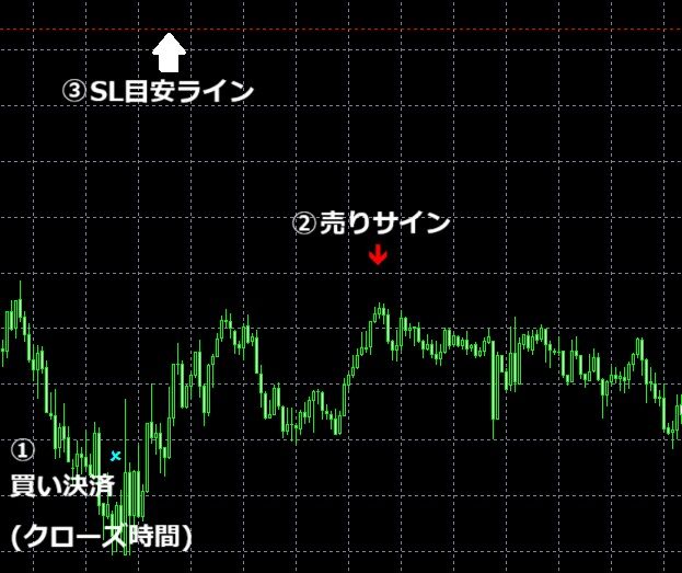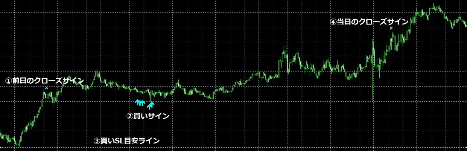 23時50分に買い決済サインが出ているので、ポジション保有中ならここで決済目安にしてください。