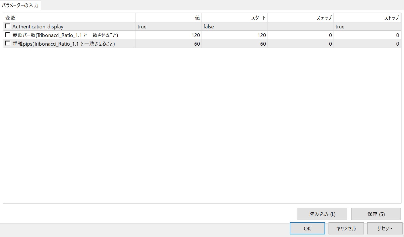 設定した参照バー数内での最高値、最安値を基準にトリボナッチラインが自動で形成されます。0%から50%の距離(pips)が設定閾値以上のとき、ラインの信頼性が高いと判断(未達ならエントリー回避)します。