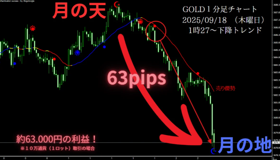 最終的に「月の地」で63pipsの利幅+63,000円の利益
