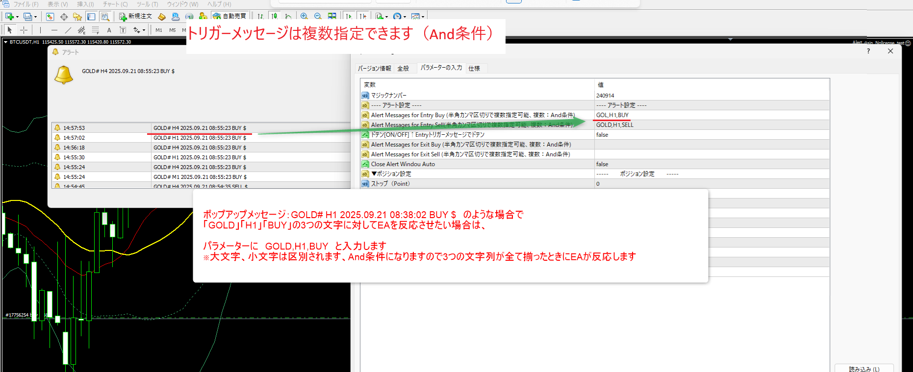 例: BTCUSDT,H1: Alert: GOLD# H1 2025.09.21 08:38:02 BUY $