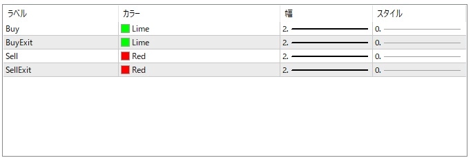 - ArrowColorBuy:買い矢印の色(デフォルト:青)