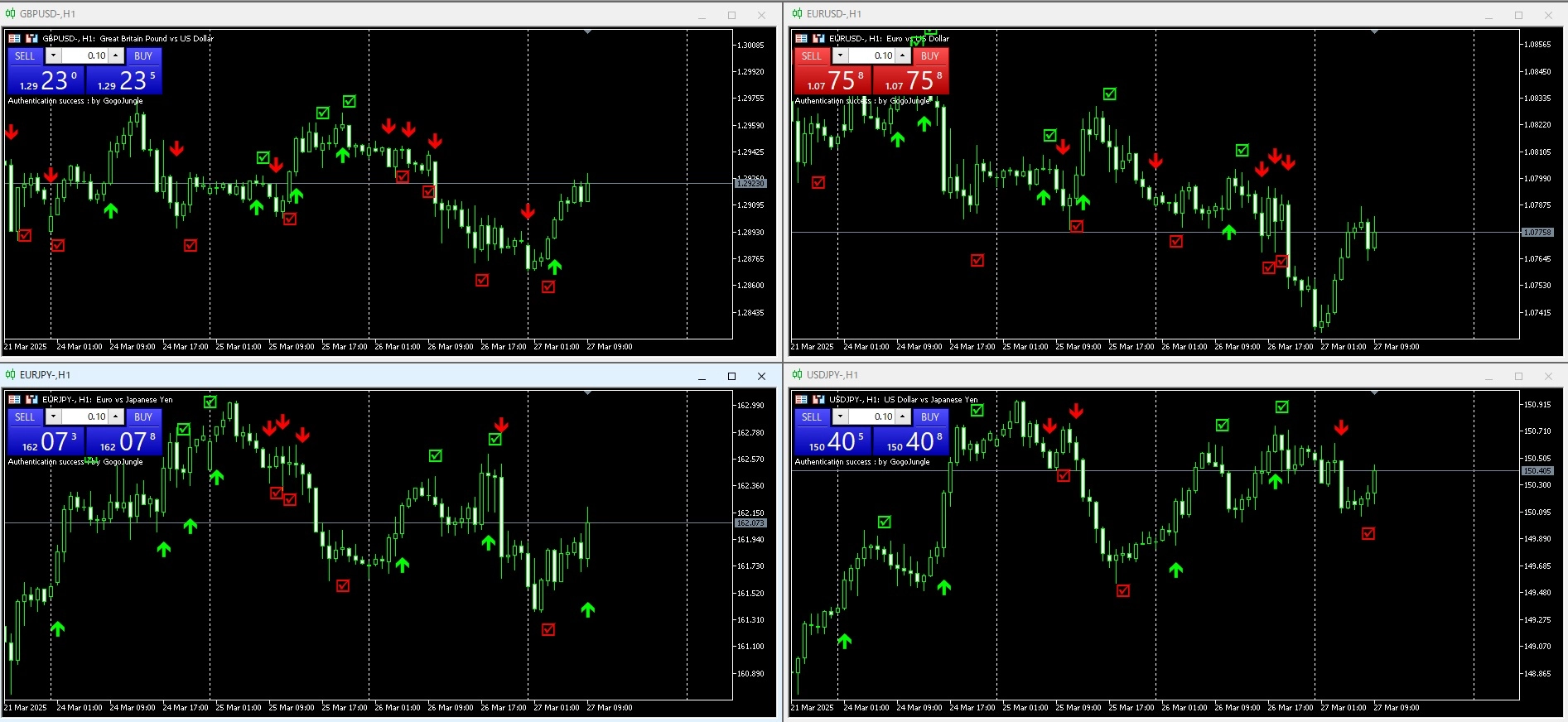 - チャート上でCCIが閾値を超えたときに売買シグナルが矢印で表示されます。