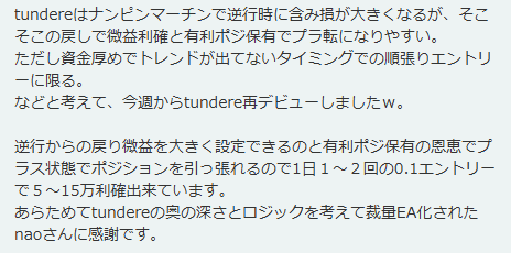 色々な設定で日々トレードしていますが、お気に入りの設定での収支やtundereの動きを見てください。