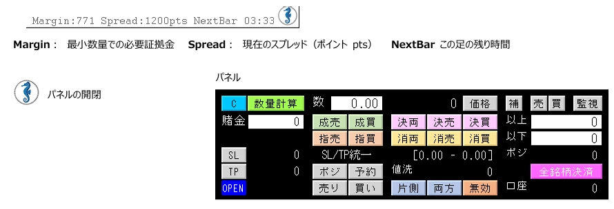 - 常に役立つ情報表示 キャンドルの残り時間、スプレッド、最小数量の必要証拠金額を常に表示し、トレードに必要な情報をリアルタイムで提供します。