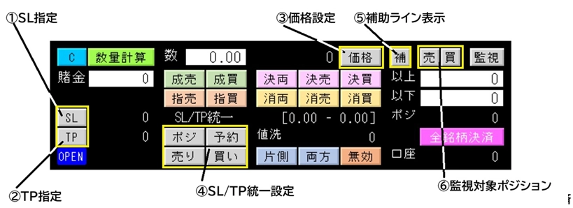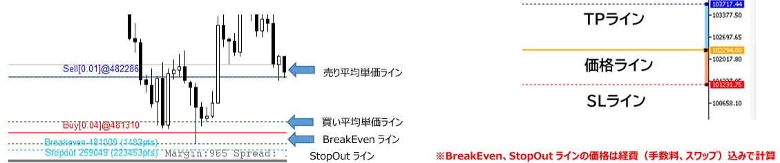 - 詳細なポジション管理と損益監視 保有ポジションの損益金額表示、口座全体の損益金額表示、合計売買数量の表示など、リアルタイムで詳細な情報を把握できます。 また、移動可能な価格ラインによる損益予想(値洗い)や、ポジションのSL/TPを一括で統一する機能は、迅速なリスクヘッジに役立ちます