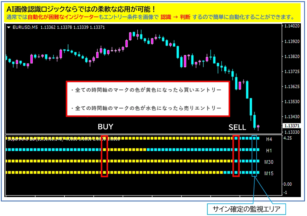独自のAI画像認識ロジックでPC画面上のサインを直接認識し、あなたに代わってエントリーを実行。さらに、AIオートパイロット搭載のEA4と連携させることで、エントリー後の決済、そして危険相場の回避まで完全自動化が可能です。