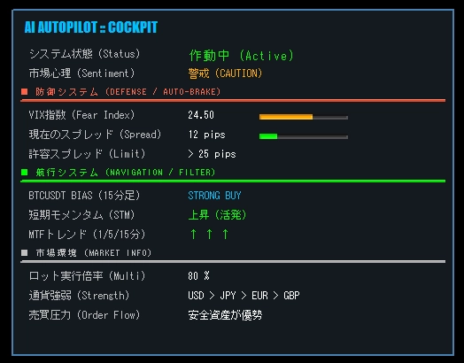 ① 守りの制御: VIX指数(恐怖指数)やスプレッドを監視し、危険な相場では「ロットの減速」や「緊急停止」を行います。
