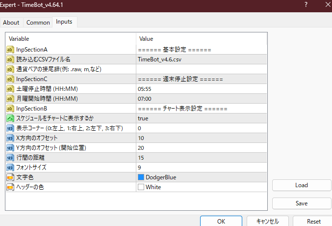 - 土曜の停止時間(例:日本時間 5:55)から月曜の開始時間(例:日本時間 7:00)までEAを自動停止