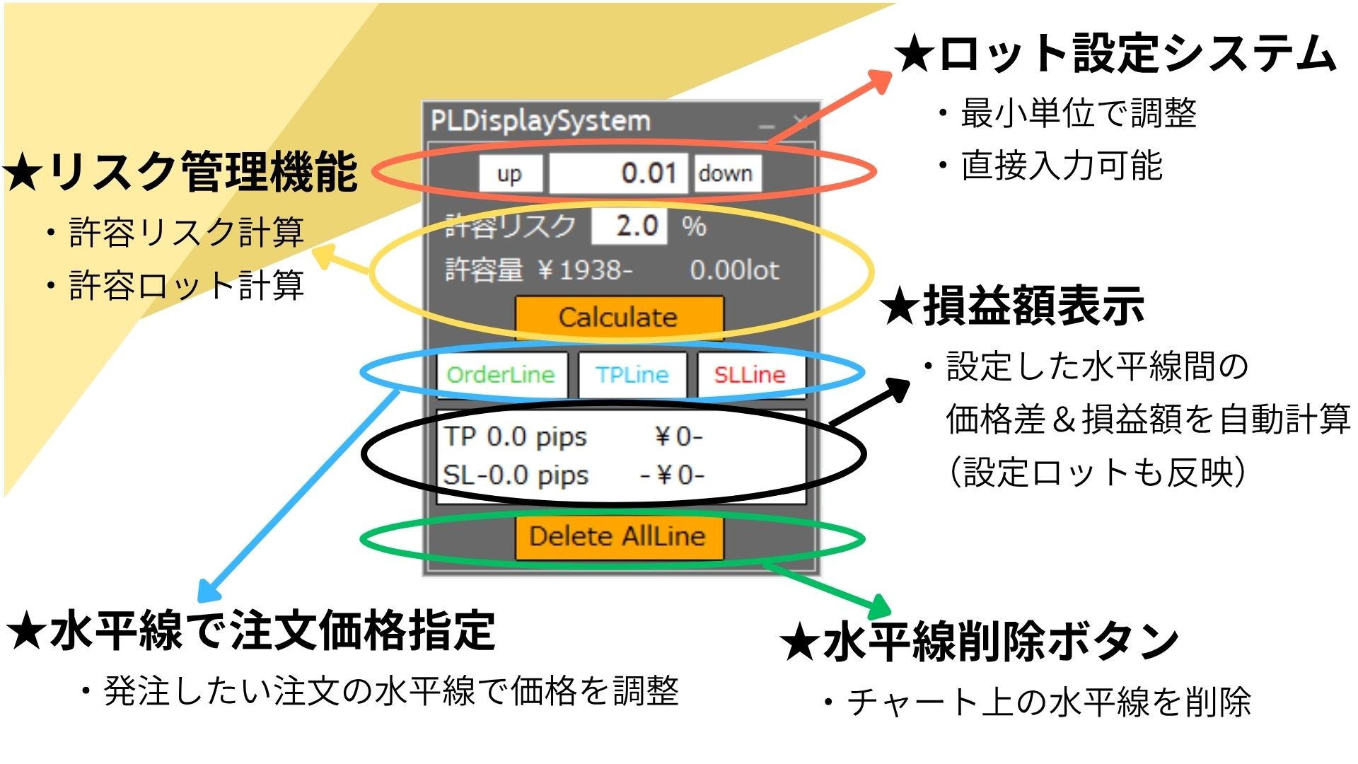 また、色分けされた水平線を設定するだけで、設定ロットを反映した損益額&変動幅(pips)を自動計算します。