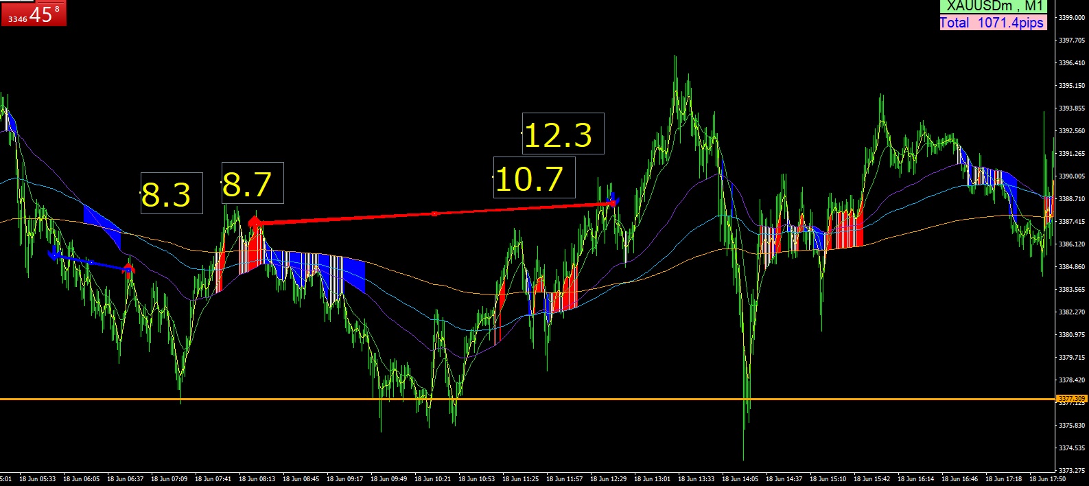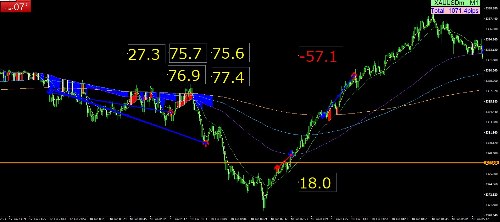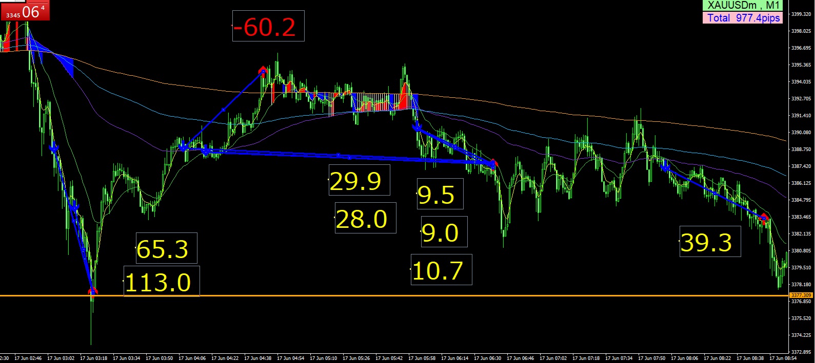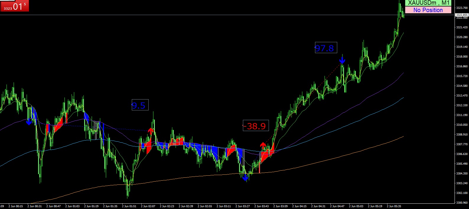 「Kintoun M1 Gold」は、5本の移動平均線が収束した瞬間を“雲”としてチャートに描画。