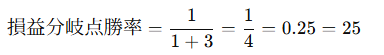 つまり、勝率25%(4回中1回勝つ)あれば、収支がトントンになる計算です。