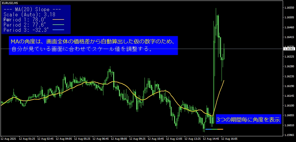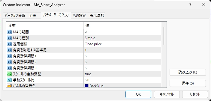 1.ボラティリティや相場の勢い次第でチャートのスケールが変動するため、角度のベースとなるスケール値を設定できるようにしています。自分だけの45度を見つけてください。自動調整でも問題なく使用できます。