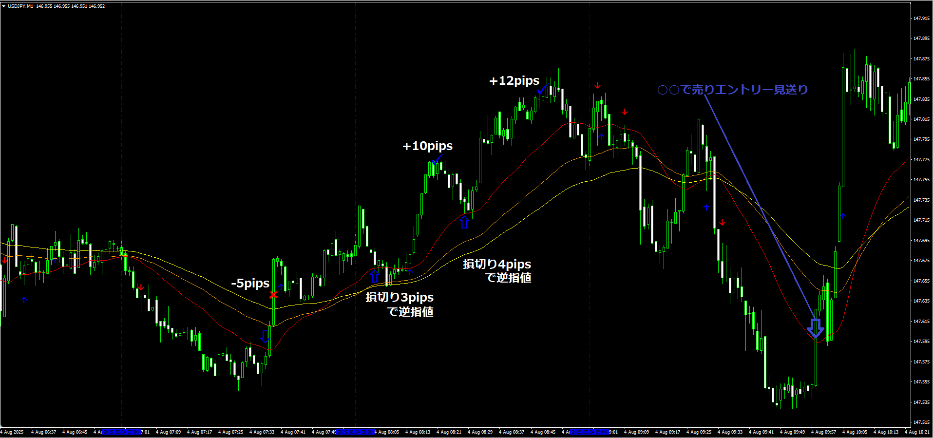 FX初心者の方でも非常に使いやすいツールとなっていて、1分足のトレンド判断やエントリーポイントが視覚的に分かり易く設計されています。スキャルピングのようにエントリーをすることで、損切りを極力抑えて、短いデイトレのように含み益を延ばす。とっても合理的なスキャルピングです!