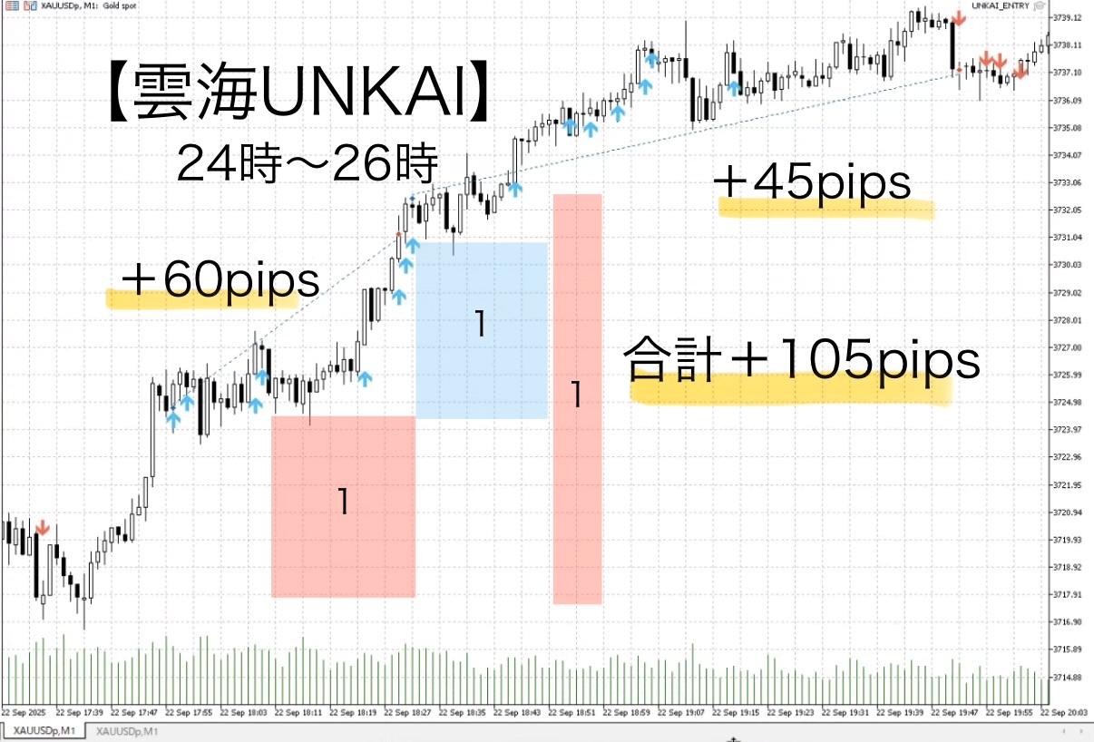 【雲海UNKAI】GOLD1分足+255pipsを映す、NY時間で怖いほど伸びる流れ──ただしサイン通りエントリーは推奨せず